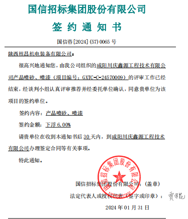 2024年1月31日,國(guó)信招標(biāo)集團(tuán)股份有限公司發(fā)來(lái)簽約通知書(shū),陜西核昌機(jī)電裝備有限公司成功中標(biāo)產(chǎn)品噴砂噴漆項(xiàng)目。自項(xiàng)目發(fā)布招標(biāo)公告以來(lái),核昌公司領(lǐng)導(dǎo)高度重視項(xiàng)目招投標(biāo)工作,認(rèn)真...